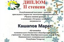 Поздравляем ученика 2А класса Кашапова Марата (педагог Зиннатуллина Гульнара Дилюсовна) с дипломом 2 степени Республиканской выставки- конкурса прикладного творчества экологической направленности "Чудеса своими руками" в номинации "Островок талантов". Молодец, Марат! Так держать! Школа гордится твоими успехами! Слова благодарности Гульнаре Дилюсовне за достойный результат!