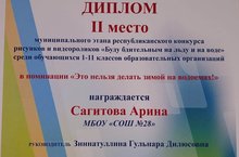 Поздравляем ученицу 4А класса Сагитову Арину (педагог Зиннатуллина Гульнара Дилюсовна) с дипломом за 2 место муниципального этапа республиканского конкурса рисунков и видеороликов «Буду бдительным на льду и на воде» среди обучающихся 1-11 классов образовательных организаций. Молодец, Арина! Школа гордится твоими успехами! Благодарим педагога Гульнару Дилюсовну Зиннатуллину.