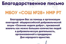 За помощь в организации ежегодной общероссийской добровольческой акции «Осенняя неделя добра», призванной вовлечь как можно большее количество людей в добровольческую деятельность, организованной в преддверии Дня народного единства, МБОУ «СОШ №28» НМР РТ было вручено Благодарственное письмо. Мы благодарим руководителя волонтерского отряда Сагитову Алину Рамилевну и желаем школьному волонтерскому объединению дальнейших побед и успехов!