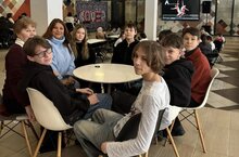 Команда 7А класса со своим классным руководителем Зиганшиной А. А. приняла участие в муниципальном чемпионате игр "Что? Где? Когда?"