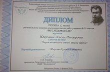 Поздравляем призера регионального конкурса исследовательских работ "Я - исследователь" Юнусову Лейсан, ученицу 9а класса.Руководитель - Юнусова Г.Р.