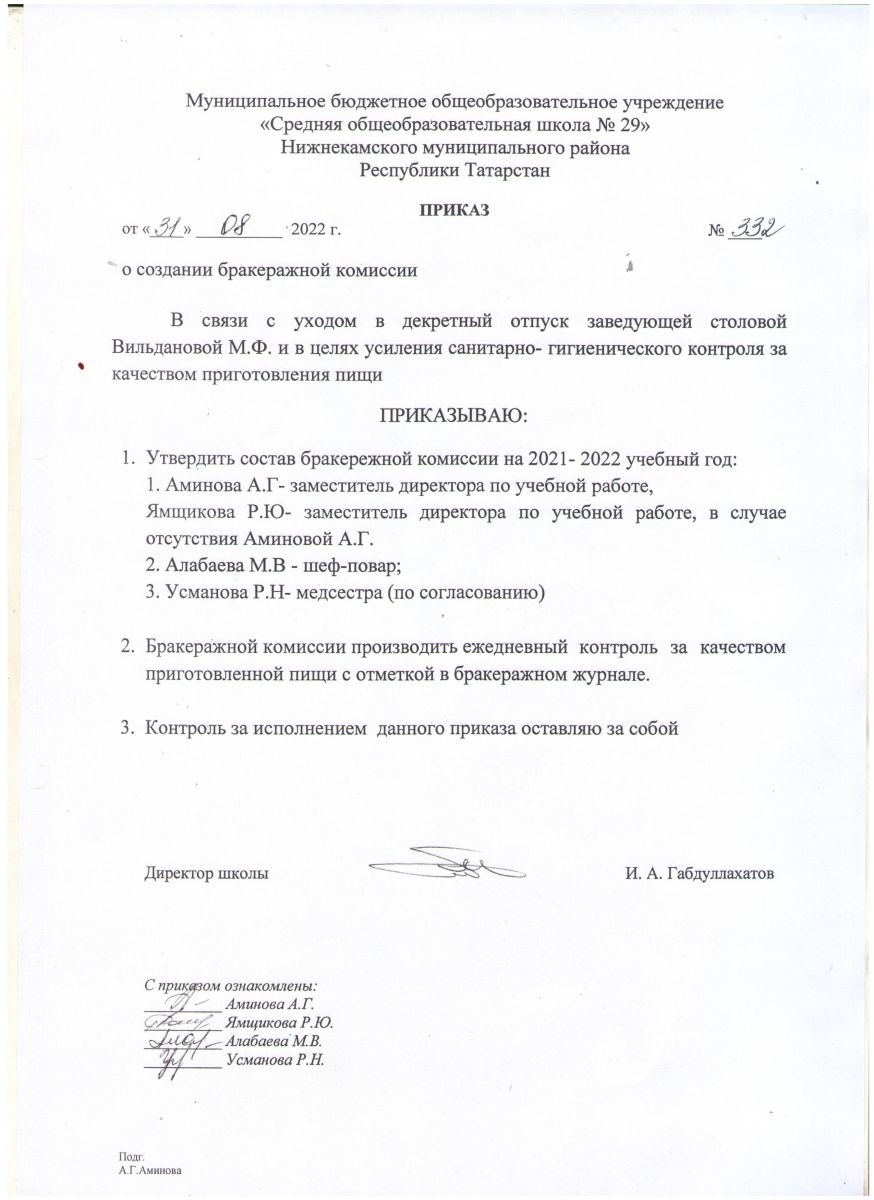 Приказ о создании бракеражной комиссии