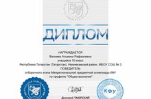 Ученица 10 "А" класса Валиева Альвина стала победителем отборочного этапа Межрегиональной предметной олимпиады КФУ по профилю "Обществознание" (педагог Ельцова И.В.). Поздравляем с заслуженной победой!