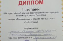Дипломом I степени II Всероссийской научно-практической конференции им. Мулланура Вахитова в секции "Родной язык и родная литература" награждена Баширова Адиля, ученица 5В класса (руководитель Гиниатуллина А.Р.). Поздравляем с победой! Молодец!