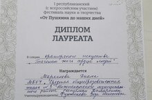 Поздравляем ученицу 11 А класса Маркелову Диану - Лауреата I Республиканского (с Всероссийским участием) фестиваля науки и творчества "От Пушкина до наших дней" в секции ораторского искусства "Глаголом жечь сердца людей" (руководитель Фунтикова Э.Н.). Молодцы! Так держать!