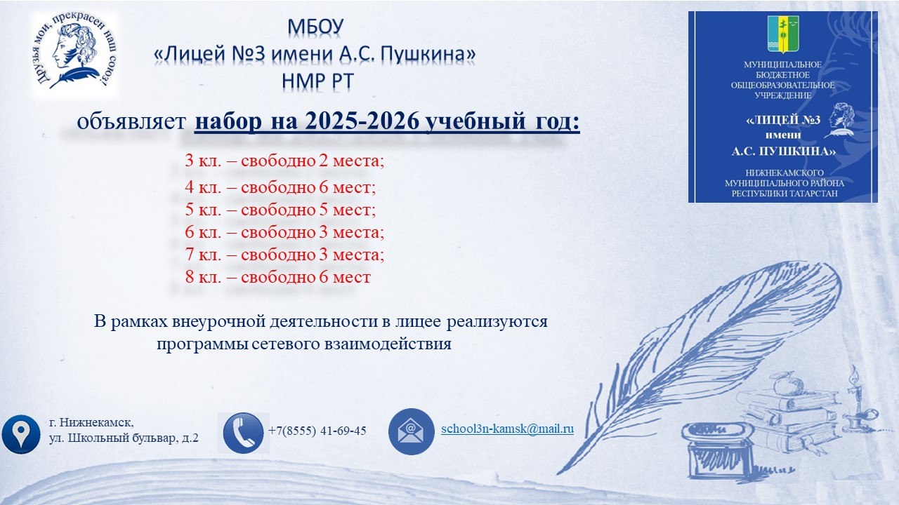Муниципальное бюджетное общеобразовательное учреждение «Лицей №3 имени А.С. Пушкина» Нижнекамского муниципального района Республики Татарстан / Татарстан Республикасы Түбән Кама муниципаль районы «А.С.Пушкин исемендәге 3 нче лицей» муниципаль бюджет гомуми белем бирү учреждениесе - новости