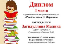 Поздравляем ученицу 2"В" класса Загидуллину Малику, занявшую 1 место в региональном творческом конкурсе "Растём, читая С. Маршака". Малика стала лучшей в номинации "Чтение вслух " в своей возрастной группе (руководитель Сазонова Л.Ю.). Молодец!