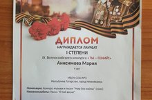Дипломом лауреата I степени IX Всероссийского конкурса "Ты-гений!" в номинации "Конкурс музыки и песен "Мир без войны" награждена ученица 3"В" класса Анисимова Мария (руководитель Николаева И.М.). Поздравляем с заслуженной победой и желаем дальнейших творческих успехов!