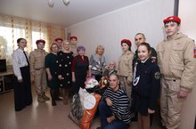 Поздравить ветерана пришли представители многих организаций города в том числе и ученики нашей школы - члены отряда Юнармии им. Героя Советского Союза Давыдова С.В. - ученики 8 «Б» класса и воспитанники подросткового клуба «Ялкын» - ученица 6 «Г» класса Тишкова Ева и ученица 6 «Б» класса Давлетова Ева.