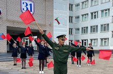 Знаменная группа вынесла Государственные флаги Российской Федерации, Республики Татарстан и знамя школы, а ребята хором исполнили Государственные Гимны.