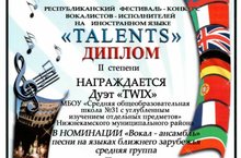 Дипломом 2 степени награжден Дуэт "TWIX" МБОУ "СОШ №31" на Республиканском фестивале-конкурсе вокалистов-исполнителей на иностранном языке "TALENTS" в номинации "Вокал-ансамбль" песни на языках ближнего зарубежья (средняя группа)под руководством Вахрушевой Л.В. и Бочкаревой С.В. Молодцы! Поздравляем!