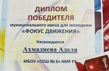 Во Дворце творчества детей и молодёжи им. И.Х. Садыкова прошло торжественное награждение победителей и призёров муниципальных конкурсов. Диплом победителя муниципального квиза "Фокус движения" получила ученица 9А класса Ахмадиева Аделя.