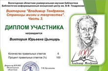 Обучающаяся 11 класса Цынцарь Виктория приняла участие в викторине "Владимир Тендряков. Страницы жизни и творчества" (учитель Сергеева Ирина Юрьевна).