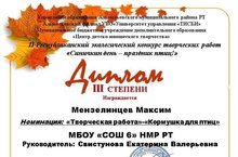 Поздравляем ученика 1В класса Мензелинцева Михаила, получившего диплом III степени II Республиканского экологического конкурса творческих работ "Синичкин день - праздник птиц!" (учитель Свистунова Екатерина Валерьевна). в этом же конкурсе ученица 5А класса Корнилова Ангелина награждена дипломом II степени в номинации "Творчество без границ" (учитель Сахабиева Аниса Рафхатовна).