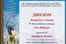 Поздравляем наших обучающихся Дорофееву Полину и Иванову Юлию, ставших лауреатами I степени IV Всероссийского конкурса "Эхо Победы" (учитель Дорофеева Лилия Ильинична). Также обучающиеся 8А класса Бариева Самира и 5В класса Хамитова Элина стали лауреатами I степени в номинациях "Исследовательские и научные работы" и "Выразительное чтение". Учитель русского языка и литературы Сергеева Ирина Юрьевна стала лауреатом I степени в номинации "Методическая разработка".