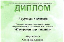Поздравляем нашу ученицу Сабирову Сафину, ставшую лауреатом I степени открытого вокального конкурса-фестиваля "Прекрасен мир поющий", проводимого для воспитанников ДТДиМ им.И.Х. Садыкова. Также Сафина стала лауреатом I степени в этом конкурсе в составе ансамбля "Камертончик" и трио "Камертончик".