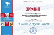 Учитель русского языка и литературы Сергеева Ирина Юрьевна приняла участие в IV Межрегиональный акции "В гостях у дедушки Корнея" (видеодекламация стихотворения Корнея Чуковского).
