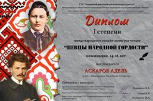 Поздравляем ученика педагогического 9Б класса Аскарова Аделя, ставшего победителем Международного онлайн-конкурса чтецов "Певцы народной гордости" (учитель Зиганшина Венера Гависовна).