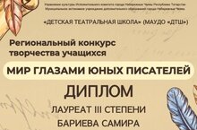 Обучающаяся Татнефть-класса Бариева Самира награждена дипломом лауреата III степени Регионального конкурса творчества учащихся "Мир глазами юных писателей" в номинации "Защитник Отечества, какой он?" (учитель Сергеева Ирина Юрьевна).