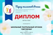 Поздравляем школьный театральный кружок "Светлячки", занявший II место в Международном дистанционном конкурсе "Волшебный мир театра" (руководитель кружка Миргасимова Гульназ Фаварисовна).