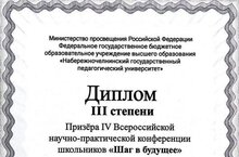 Поздравляем победителей IV Всероссийской научно-практической конференции школьников "Шаг в будущее": ученицу 5А класса Насибуллину Самиру (I место, учитель Зиганшина Венера Гависовна), ученика педагогического 9Б класса Аскарова Аделя (I место, учителя Зиганшина Венера Гависовна, Шайдуллина Танзиля Рахимулловна), ученицу педагогического 9Б класса Дорофееву Полину (I место, учитель Дорофеева Л.И.), ученицу 8А Татнефть-класса Бариеву Самиру (II место, учитель Сергеева Ирина Юрьевна), уученицу 5В класса Хамитову Элину (III место, учитель Сабирова Ралена Даимовна). Все педагоги, подготовившие победителей, получили благодарственные письма.