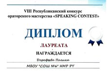 Поздравляем ученицу 9Б класса Дорофееву Полину, награжднную Дипломом лауреата Республиканского конкурса ораторского мастерства "Speaking contest" (учитель Саттарова Алина Салаватовна), ученицу 6А класса Ильину Викторию, занявшую III место (учитель Гимадеева Ляля Мунировна) и получившую Диплом лауреата (учитель Шарифуллина Лилия владимировна). Сертификаты участников получили ученицы 10А класса Булатова Ильзира (учитель Саттарова Алина Салаватовна) и Иванова Екатерина (учитель Гимадеева Ляля Мунировна). Учитель русского языка и литературы Сергеева Ирина Юрьевна награждена Дипломом I степени в категории "Учителя".
