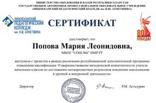 Учитель начальных классов Попова Мария Леонидовна представила свой проект в рамках реализации Республиканской дополнительной программы повышения квалификации "Совершенствование методической компетенции учителя начальных классов по достижению метапредметных результатов младшими школьниками в урочной и внеурочной деятельности".