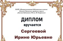 Поздравляем учителя русского языка и литературы Сергееву Ирину Юрьевну, получившую диплом I степени конкурса отзывов о прочитанной книге "Литературное эссе", проведённого Детской библиотекой им. Н. Островского.