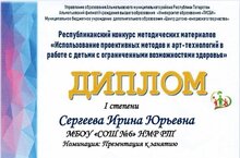 Поздравляем учителя русского языка и литературы Сергееву Ирину Юрьевну, занявшую 1 место в Республиканском конкурсе методических разработок "Использование проективных методов и арт-технологий в работе с детьми с ограниченными возможностями здоровья" в номинации "Презентация к занятию", а также учителя начальных классов Попову Марию Леонидовну и логопеда Хаерову Зою Владимировну, получивших диплом 1 степени в номинации "Конспект занятия" и диплом 2 степени - в номинации "Сценарий воспитательного мероприятия".