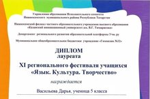 Диплом лауреата XI Регионального фестиваля учащихся "Язык. Культура. Творчество" в секции "Художественное слово" получила ученица 5Б класса Васильева Дарья (учитель Сахабиева Аниса Рафхатовна). ученик 5Б класса Янгирова Ильдар занял III место в секөии "Лиературоведение" этоо фестиваля (учитель Сабирова Ралена Даимовна).