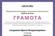 Поздравляем обучающихся 3А класса, занявших I место по школе в образовательном марафоне "Космическое приключение", который прошел на Всероссийской платформе Учи.ру (классный руководитель Сагдиева Ирина Владимировна).