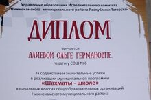 Тьютор по шахматам, руководитель городского методического объединения по шахматам Алиева Ольга Германовна награждена Дипломом Управления образования НМР РТ за содействие и значительные успехи в реализации муниципальной программы "Шахматы - школе".