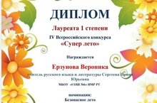Ученица 6Б класса Ерзунова Вероника награждена Дипломом I степени IV Всероссийского конкурса "Супер лето" в номинации "Безопасное лето" со стихотворением "Берегите лес" (учитель Сергеева Ирина Юрьевна). в этом же конкурсе II место заняла ученица 6А класса Раззаренова Милана в номинации "Чудеса на грядке и клкмбе" (учитель Зиганшина Венера Гависовна).