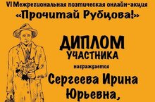 Учитель русского языка и литературы Сергеева Ирина Юрьевна приняла участие в VI Межрегиональной поэтической онлайн-акции "Прочитай Рубцова!" в номинации "Видеоролик" с декламацией стихотворения.