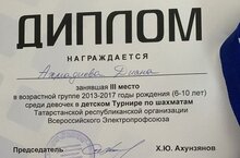 Поздравляем ученицу 1А класса Ахмадиева Диану, занявшую III место в возрастной группе 2013-2017 годов рождения среди девочек в детском Турнире по шахматам Татарстанской республиканской организации Всероссийского Электропрофсоюза.
