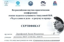 Наши обучающиеся приняли участие во Всероссийской научно-практической конференции имени педагога-гуманиста Ащеуловой В.И. "Через слово и дело к разуму и сердцу": дипломами лауреата награждены Насибуллина Самира (6А) (руководитель Зиганшина Венера Гависовна) и Иванова Юлия (9А) (руководитель Дорофеева Лилия Ильинична), дипломом III степени - Дорофеева Полина (10А) (руководитель Дорофеева Лилия Ильинична). Педагоги Сергеева Ирина Юрьевна, Зиганшина Венера Гависовна и Дорофеева Лилия Ильинична выступили с докладами на этой конференции.