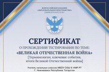 Учитель начальных классов Сагдиева Ирина Владимировна успешно прошла тестирование по теме "Великая Отечественная война".