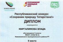 Поздравляем ученицу 5Б класса Миргалимову Владу, занявшую II место в Республиканском конкурсе "Сохраним природу Татарстана!" в номинации "Красная книга РТ. Птицы (лесные) " (учитель Сахабиева Аниса Равхатовна).