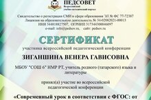 Учитель татарского языка и литературы Зиганшина Венера Гависовна приняла участие во Всероссийской педагогической конференции "Современный урок в соответствии с ФГОС: о теори к практике".