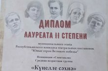 Поздравляем театральный коллектив школы "Күңелле сәхнә", ставший лауреатом второй степени муниципального этапа Республиканского конкурса театральных постановок "Юные герои Великой Победы", в номинации "Спектакли" (преподаватель Шайдуллина Танзиля Рахимулловна).