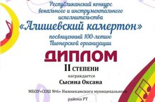 1-3 декабря 2022 года прошел Республиканский конкурс вокального и инструментального исполнительства «Алишевский камертон». Конкурс был посвящён 100-летию образования Пионерской организации. Данная тема была отражена в конкурсных номерах номинации «Кто привык за победу бороться». Исполнялись пионерские песни, вокальные и инструментальные произведения Советского периода. Участниками мероприятия стали дети от 4 лет и старше, а так же педагоги по вокальному и инструментальному искусству. Конкурсные работы оценивали известные деятели культуры РТ. Поздравляем Сысину Оксану, дипломанта 2 степени Республиканского конкурса вокального и инструментального исполнительства "Алишевский камертон" (учитель Нафикова Г.Р.).