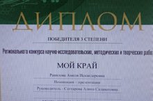 Дипломом победителя третьей степени Регионального конкурса научно-исследовательских, методических и творческих работ "Мой край" награждена Равилова Амиля (учитель Саттарова Алина Салаватовна).