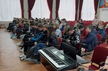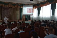 В актовом зале школы проводится лекция о здоровье для учащихся 5-6 классов. Детям рассказывают о выборе безопасных наушников.