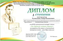 Поздравляем Хузягалиева Амира, занявшего третье место в Региональном конкурсе чтецов «За строкой летит строка" (учитель Зиганшина Венера Гависовна).