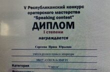 Активное участие наша школа приняла в Республиканском конкурсе ораторского мастерства. Дипломом первой степени в категории "Учителя" награждена Сергеева Ирина Юрьевна, она же получила свидетельство члена жюри конкурса.