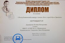 Поздравляем обучающуюся 6Б класса школы №6 Дорофееву Полину, занявшую второе место в Республиканском конкурсе чтецов, посвященном поэту-герою Мусе Джалилю (учитель Гимадеева Ляля Мунировна).