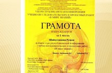 Поздравляем обучающуюся 3 «А» класса Шайхудинову Рузилю занявшую первое место в очном туре республиканской конференции учебно –исследовательских и проектных работ «В мире знаний» (учитель Зиганшина В.Г., Сабирова Р.Д.)