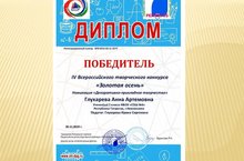 Поздравляем Глухареву Анну (2"а" класс)- победителя Всероссийского творческого конкурса "Золотая осень". На конкурс , который проводился в республике Дагестан, была отправлена декоративно - прикладная работа из природного материала .( учитель Глухарева Ирина Сергеевна)