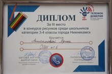 Поздравляем Анисимову Арину, занявшую третье место в муниципальном конкурсе рисунков, посвященном детскому телефону доверия. Педагог Талипова Резеда Наилевна