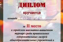 20.06.2018 года на базе нашей школы был проведён городской шахматно-шашечный турнир среди пришкольных оздоровительных лагерей общеобразовательных учреждений в зачет спартакиады школьников по настольным интеллектуальным видам спорта. В данном турнире наша школа заняла 2 место. Ребята, вы молодцы!